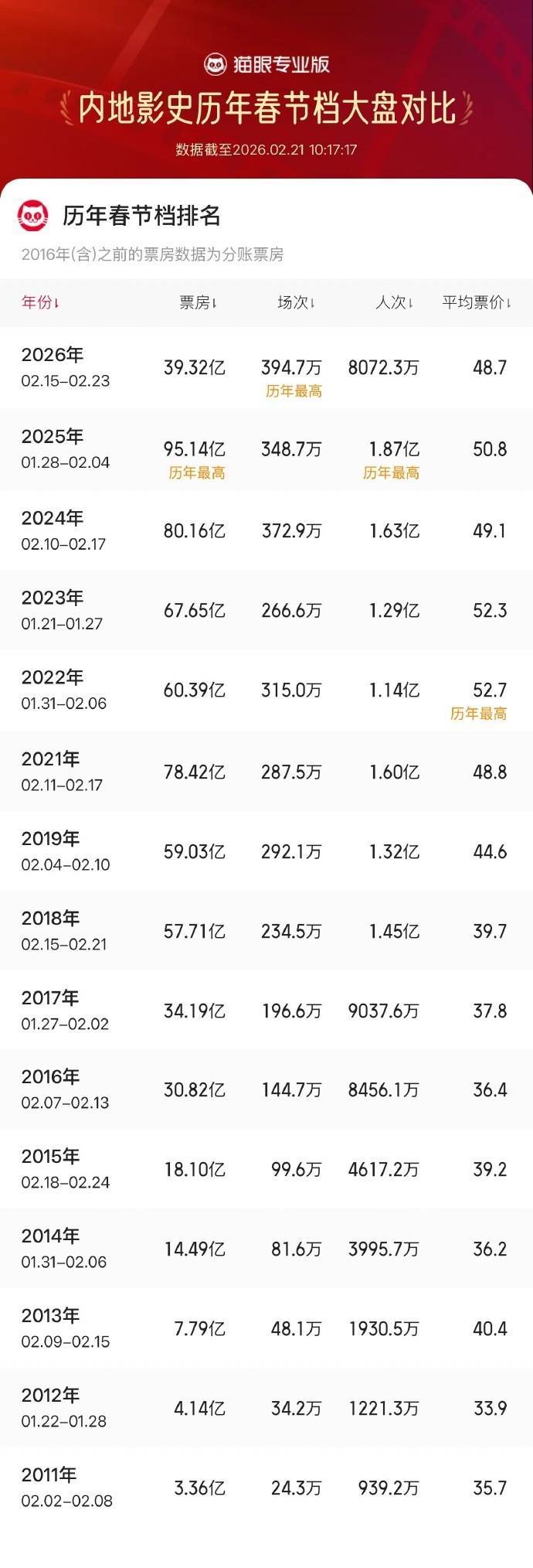 IT之家 2 月 21 日消息,据猫眼专业版数据显示,2026 年春节档总场次超 394.7 万,刷新中国影史春节档总场次纪录。
