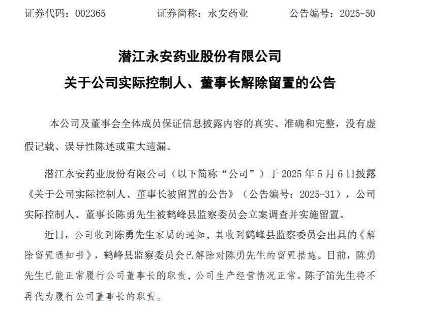 永安药业公告中表示,收到陈勇家属通知,其收到鹤峰县监察委员会出具的《解除留置通知书》,鹤峰县监察委员会已解除对陈勇的留置措施。目前,陈勇已能正常履行公司董事长的职责,公司生产经营情况正常。陈子笛将不再代为履行公司董事长的职责。
